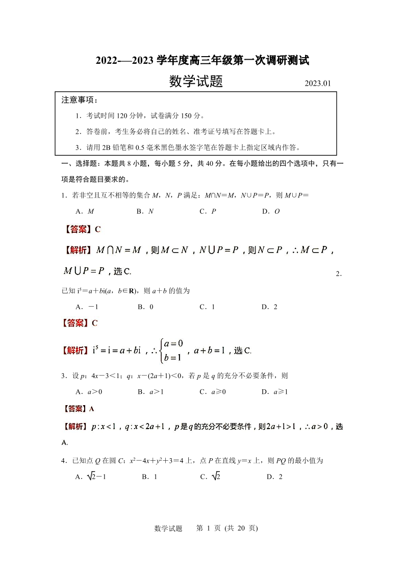 高三数学(解析版)--江苏省苏北四市2022-2023学年高三第一次调研测试