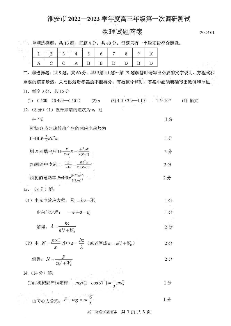 高三物理答案--江苏省苏北四市2022-2023学年高三第一次调研测试