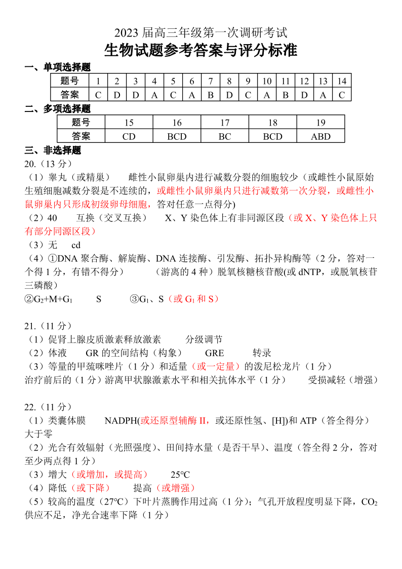 高三生物答案--江苏省苏北四市2022-2023学年高三第一次调研测试