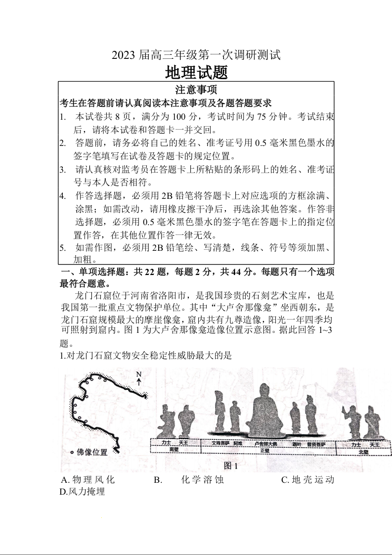 高三地理+答案--江苏省苏北四市2022-2023学年高三第一次调研测试
