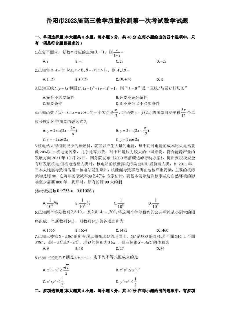 高三数学--湖南省岳阳市2023届高三教学质量监测(一)