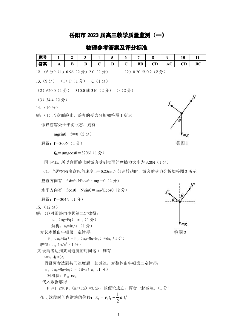高三物理答案--湖南省岳阳市2023届高三教学质量监测(一)