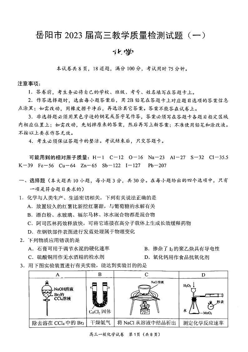 高三化学--湖南省岳阳市2023届高三教学质量监测(一)