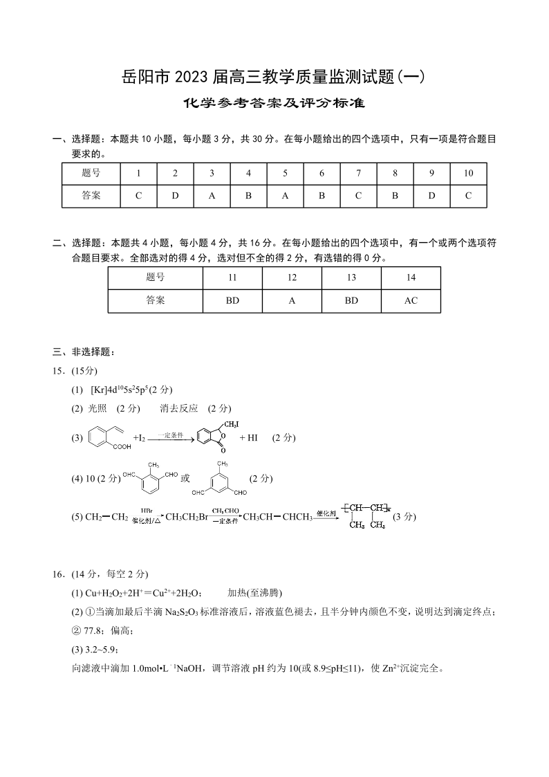 高三化学答案--湖南省岳阳市2023届高三教学质量监测(一)