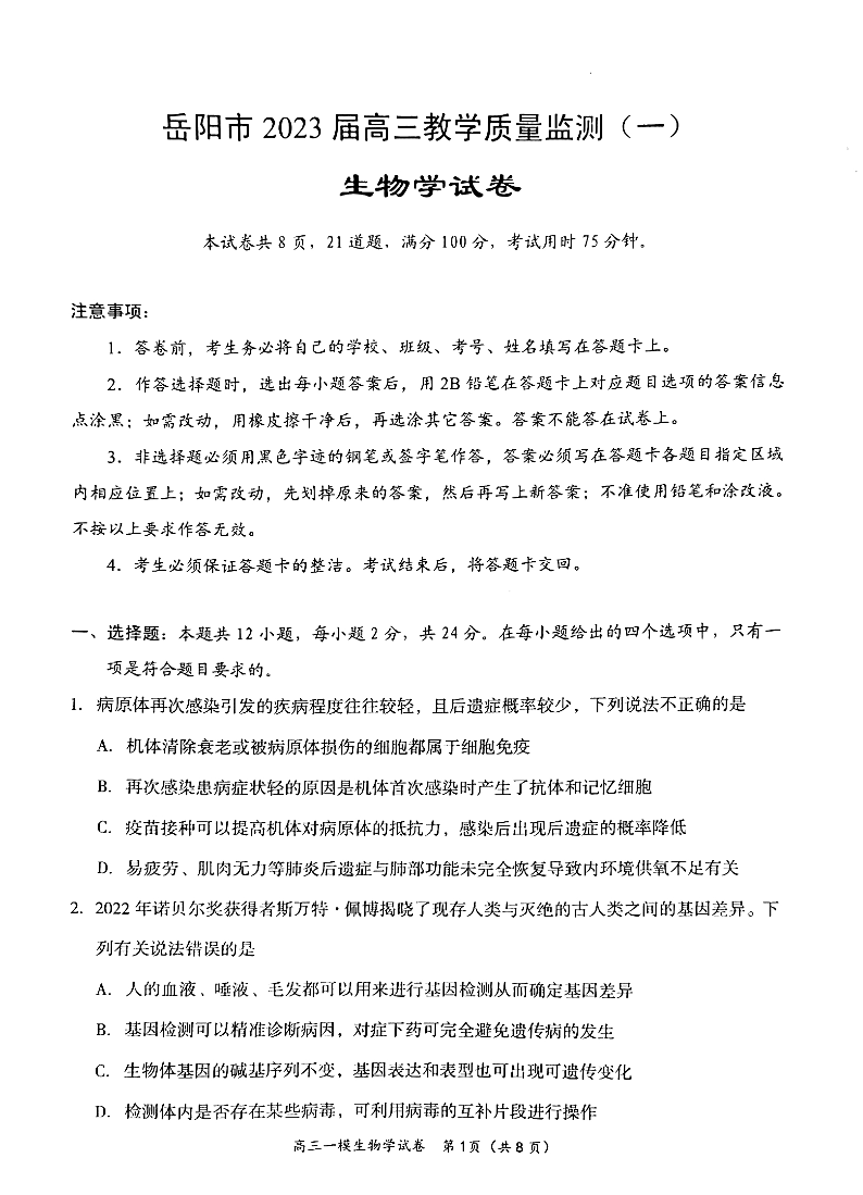 高三生物--湖南省岳阳市2023届高三教学质量监测(一)