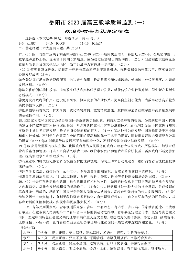 高三政治答案--湖南省岳阳市2023届高三教学质量监测(一)