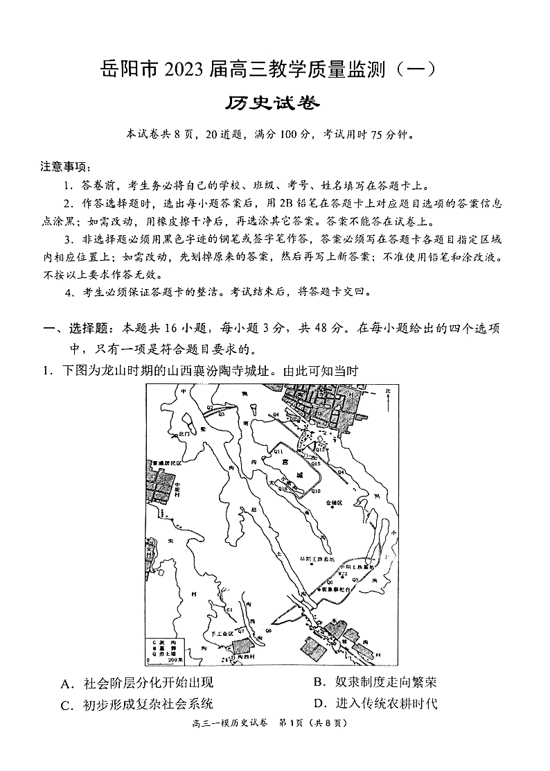 高三历史--湖南省岳阳市2023届高三教学质量监测(一)