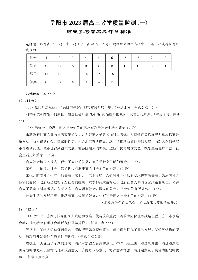 高三历史答案--湖南省岳阳市2023届高三教学质量监测(一)