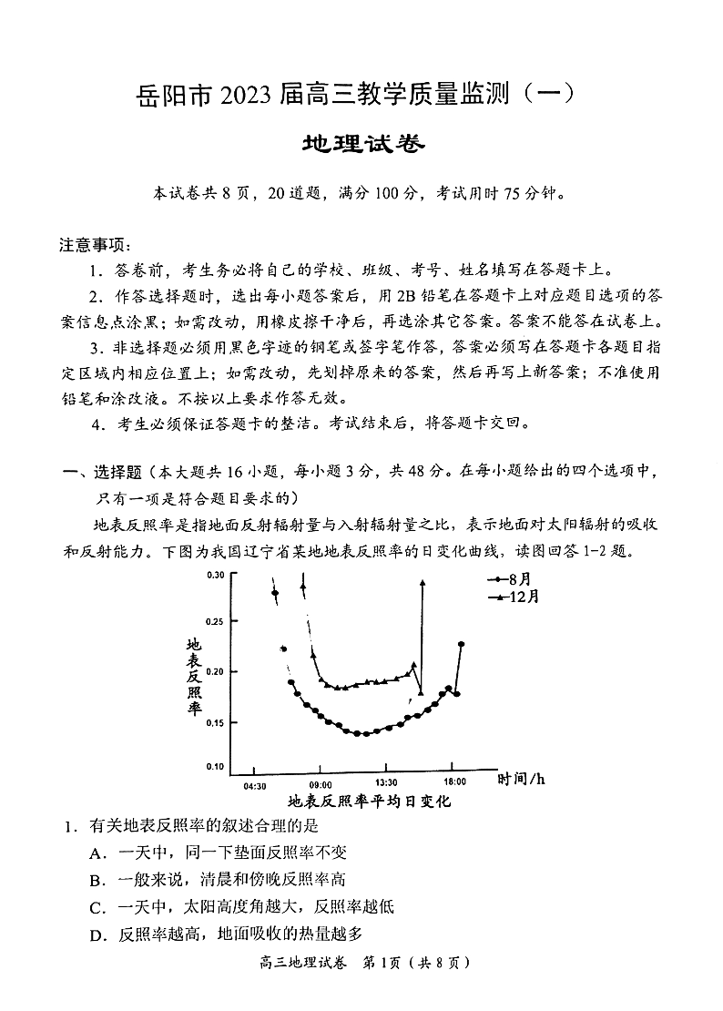 高三地理--湖南省岳阳市2023届高三教学质量监测(一)