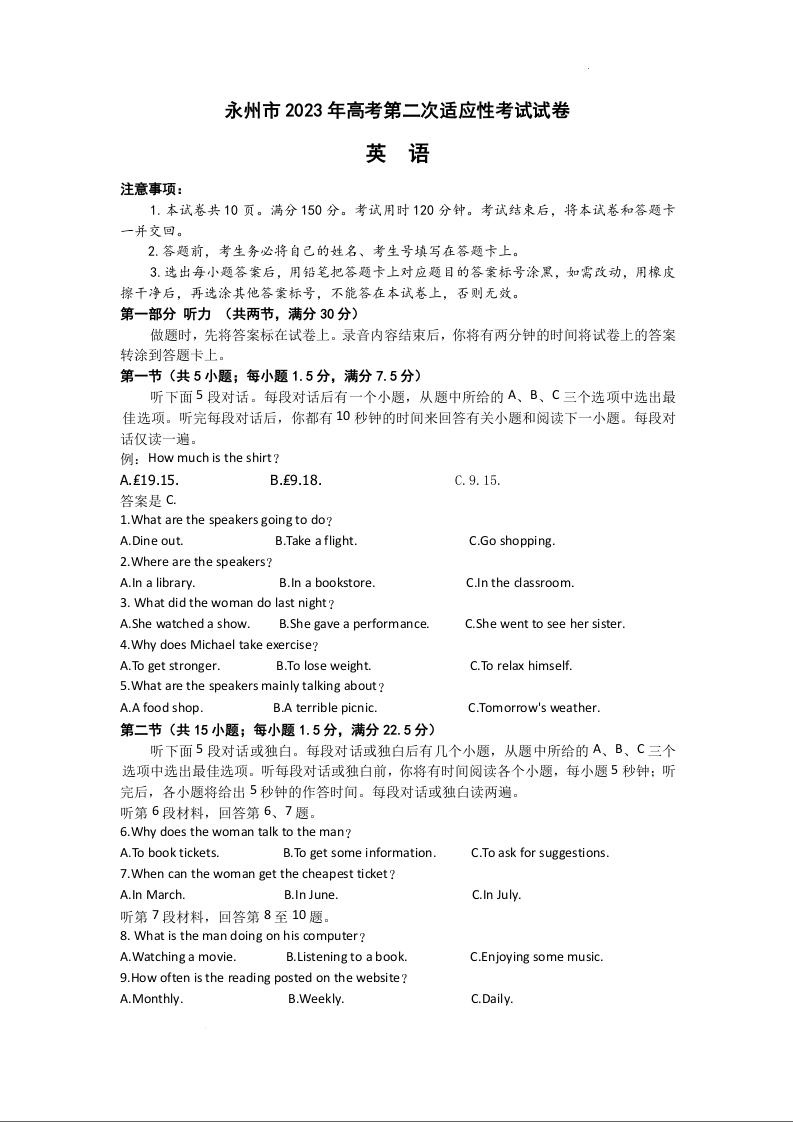高三英语+答案--湖南省永州市2023高三第二次适应性考试(二模)