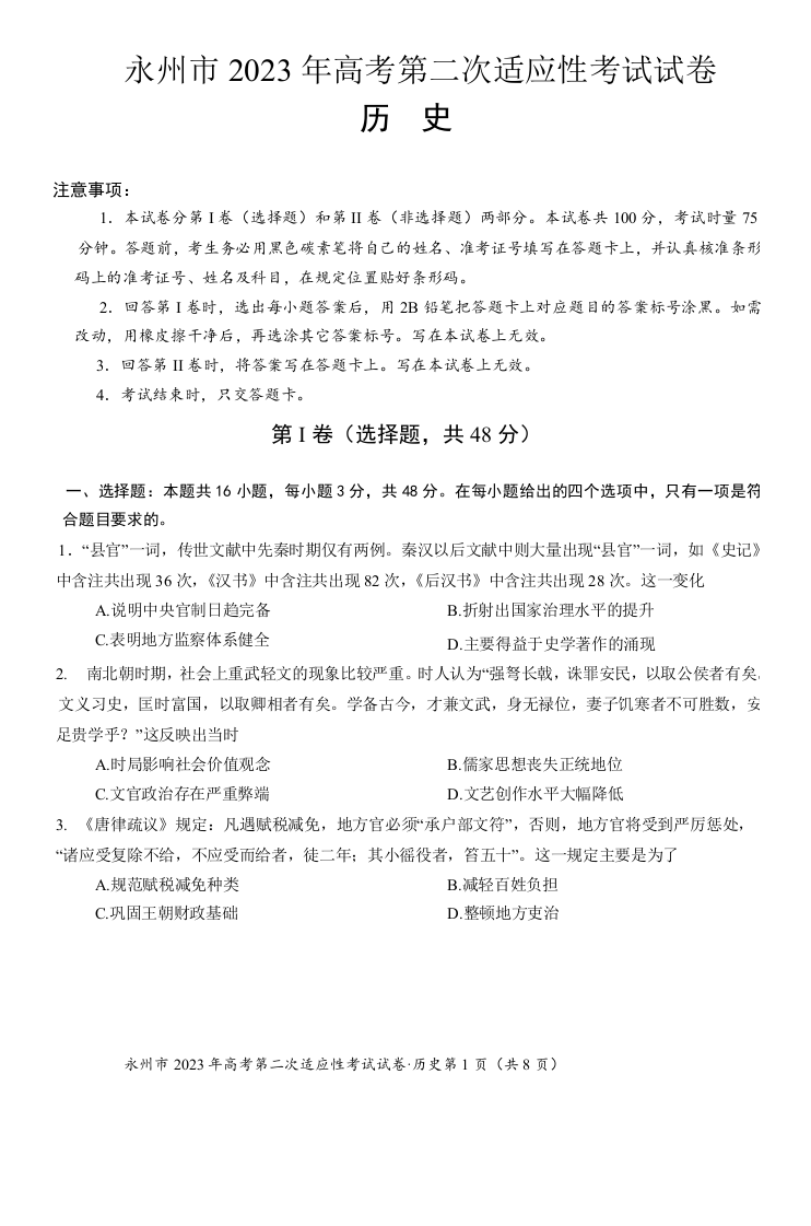 高三历史+答案--湖南省永州市2023高三第二次适应性考试(二模)