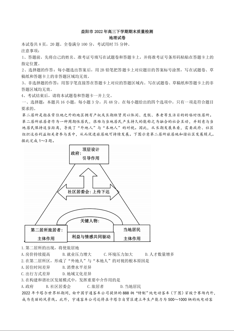 高三地理+答案--湖南省益阳市2022-2023学年高三上学期期末质量检测
