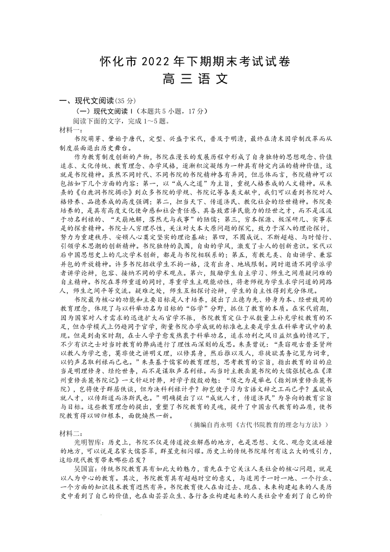 高一语文+答案--湖南省怀化市2022-2023学年高三上学期期末考