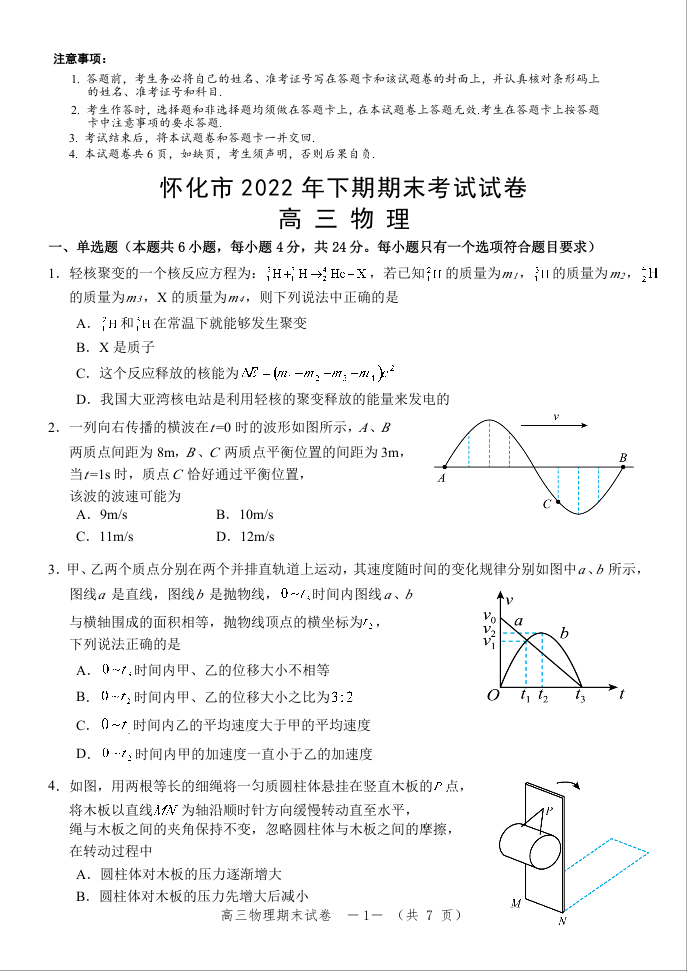 高一物理--湖南省怀化市2022-2023学年高三上学期期末考