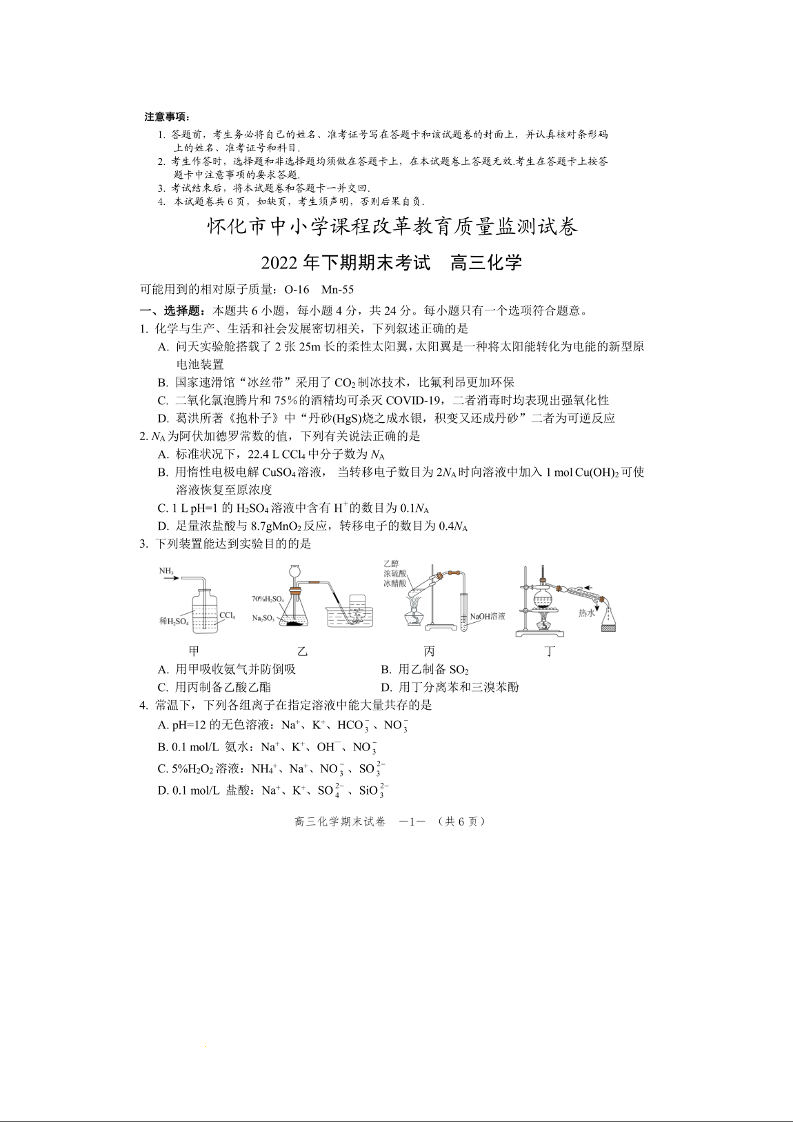 高一化学+答案--湖南省怀化市2022-2023学年高三上学期期末考