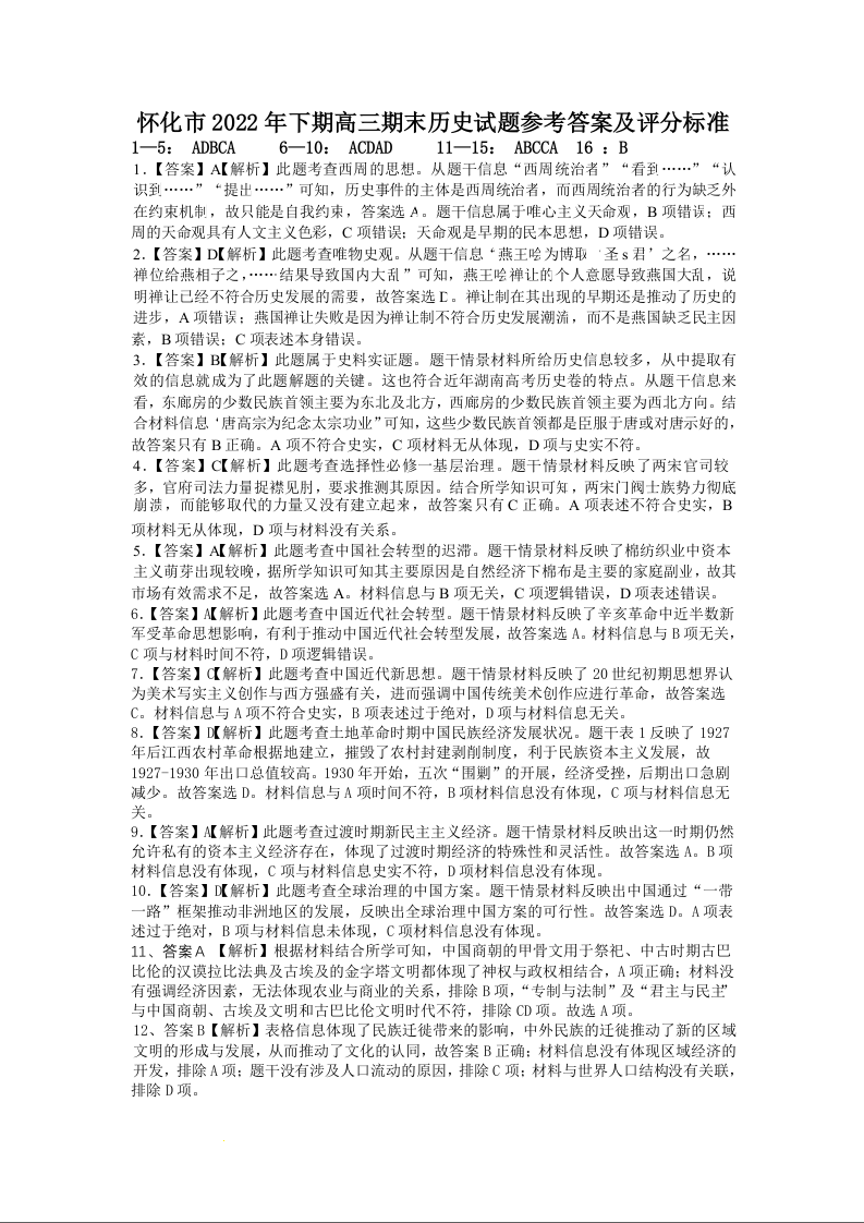 高一历史答案--湖南省怀化市2022-2023学年高三上学期期末考
