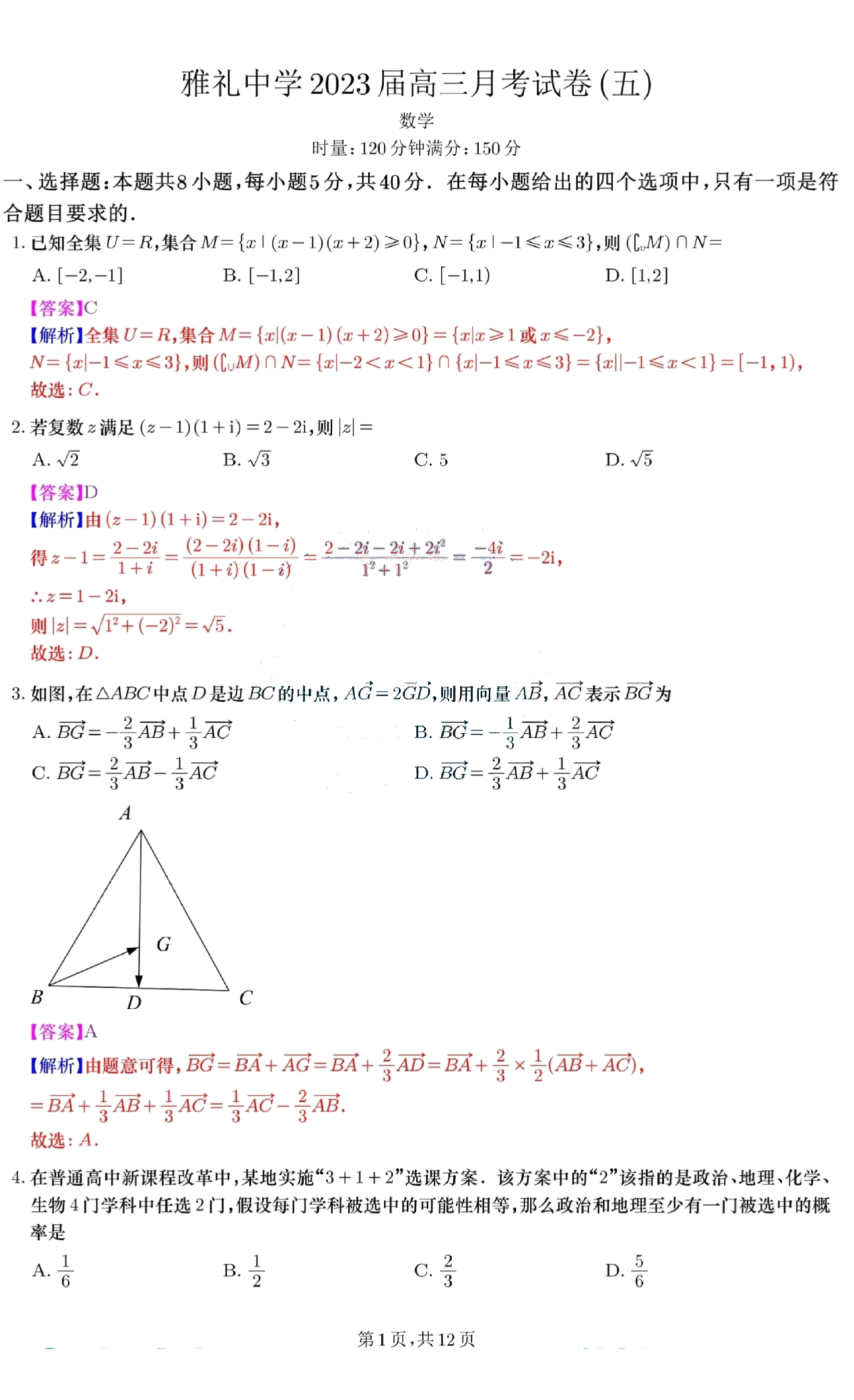 高三数学答案--湖南省长沙市雅礼中学2022-2023学年高三上学期月考卷(五)