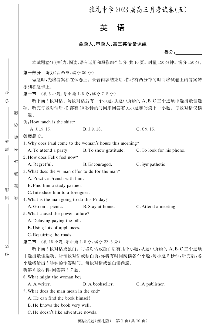 高三英语--湖南省长沙市雅礼中学2022-2023学年高三上学期月考卷(五)
