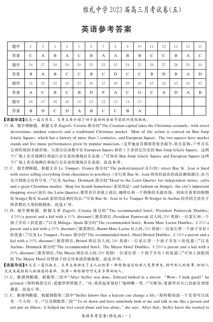 高三英语答案--湖南省长沙市雅礼中学2022-2023学年高三上学期月考卷(五)