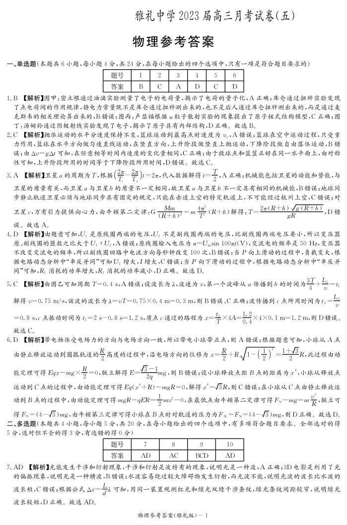 高三物理答案--湖南省长沙市雅礼中学2022-2023学年高三上学期月考卷(五)