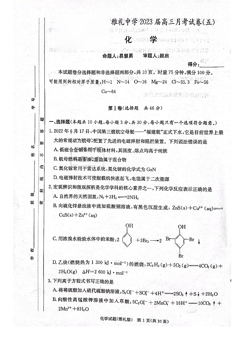 高三化学--湖南省长沙市雅礼中学2022-2023学年高三上学期月考卷(五)
