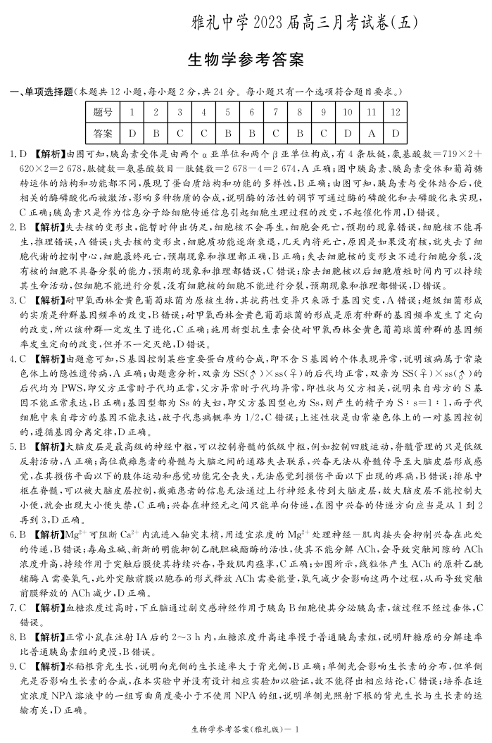 高三生物答案--湖南省长沙市雅礼中学2022-2023学年高三上学期月考卷(五)