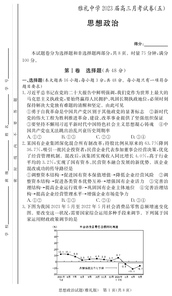 高三政治--湖南省长沙市雅礼中学2022-2023学年高三上学期月考卷(五)