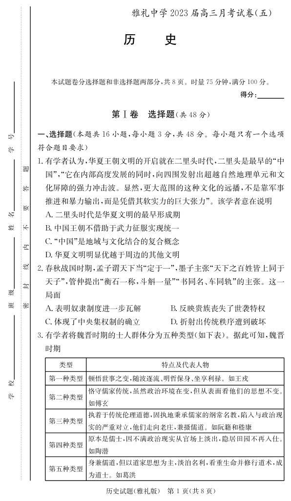 高三历史--湖南省长沙市雅礼中学2022-2023学年高三上学期月考卷(五)