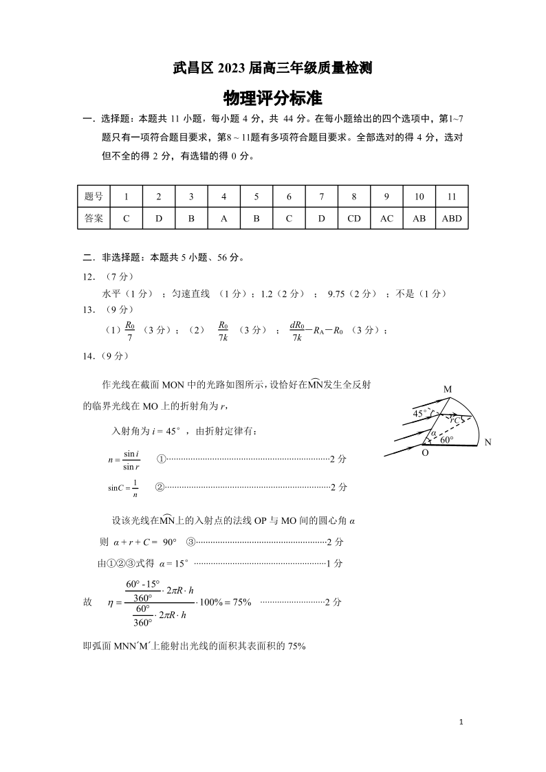 高三物理答案--湖北省武汉市武昌区2023届高三元月调考卷