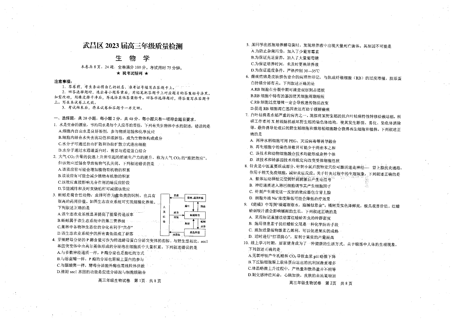 高三生物--湖北省武汉市武昌区2023届高三元月调考卷