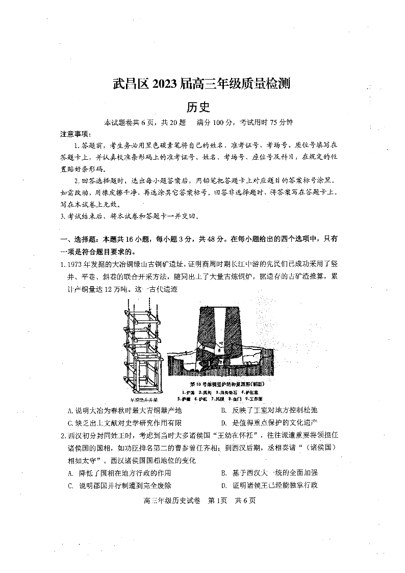 高三历史--湖北省武汉市武昌区2023届高三元月调考卷