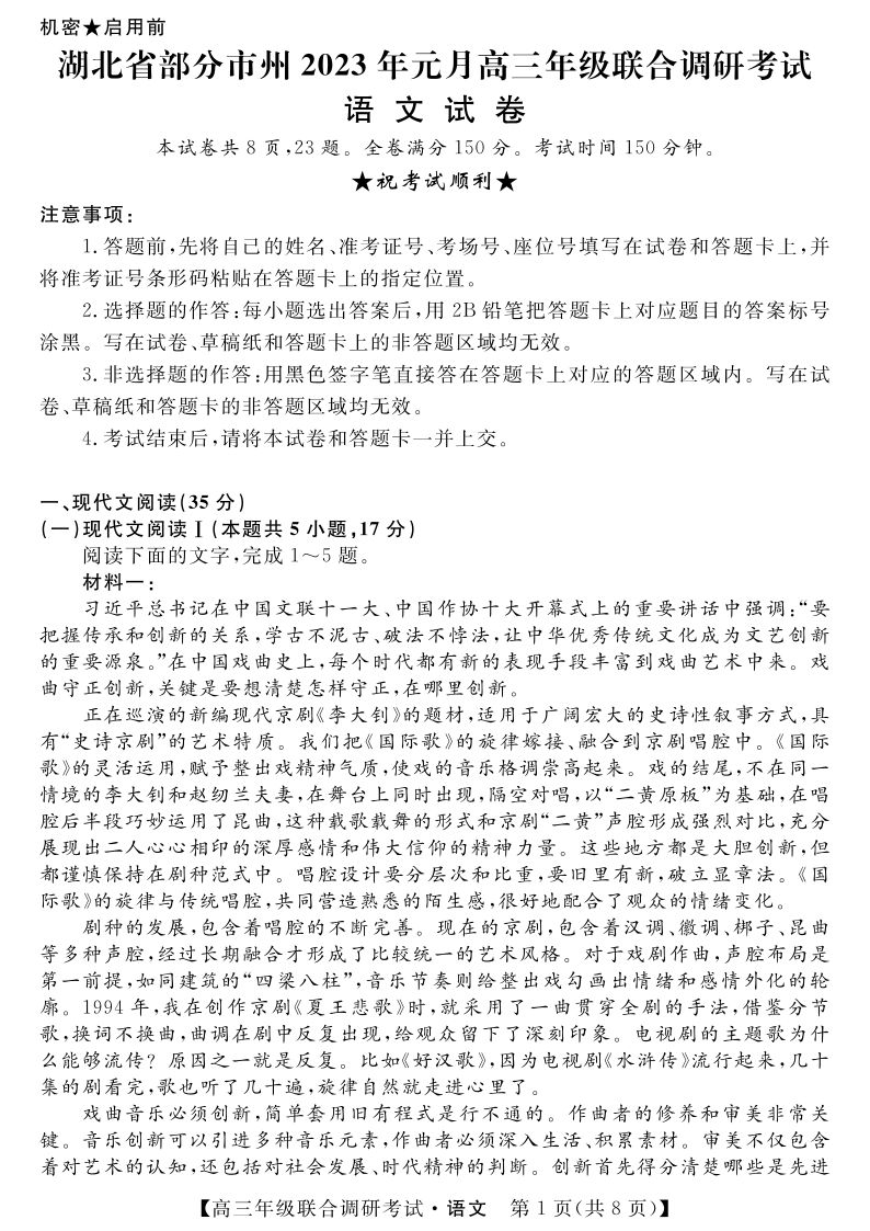 高三语文--湖北省部分市州2022-2023学年高三元月联合调研考试