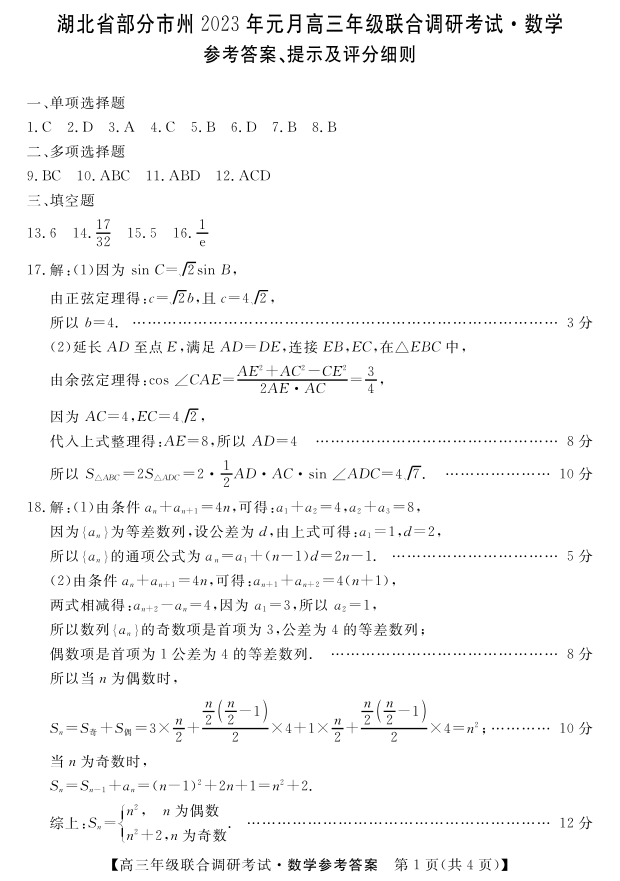 高三数学答案--湖北省部分市州2022-2023学年高三元月联合调研考试