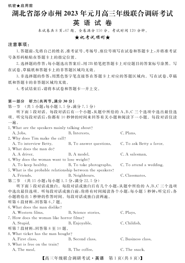 高三英语答案--湖北省部分市州2022-2023学年高三元月联合调研考试