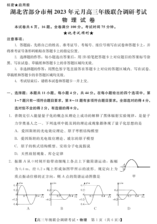 高三物理--湖北省部分市州2022-2023学年高三元月联合调研考试