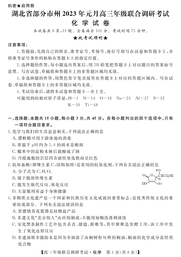 高三化学--湖北省部分市州2022-2023学年高三元月联合调研考试