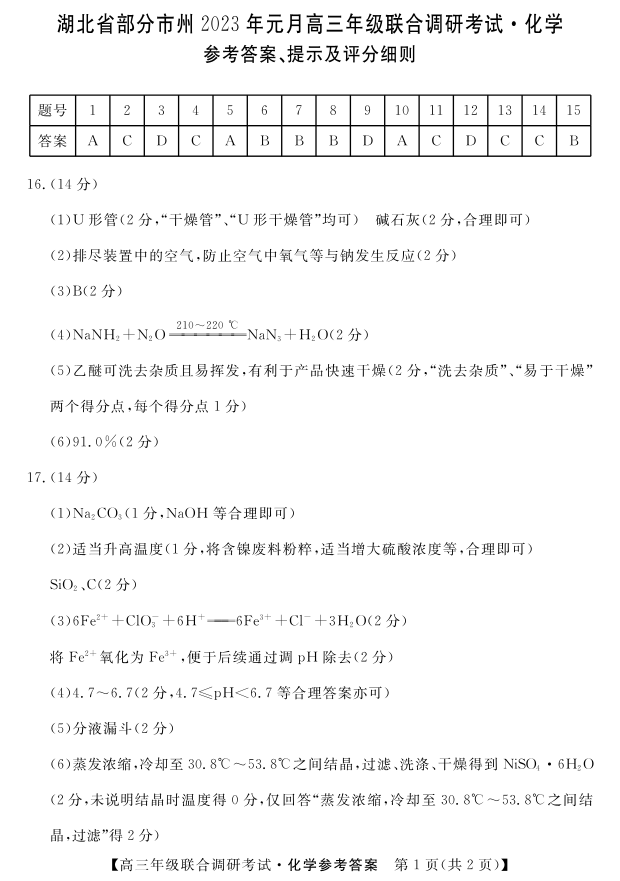 高三化学答案--湖北省部分市州2022-2023学年高三元月联合调研考试