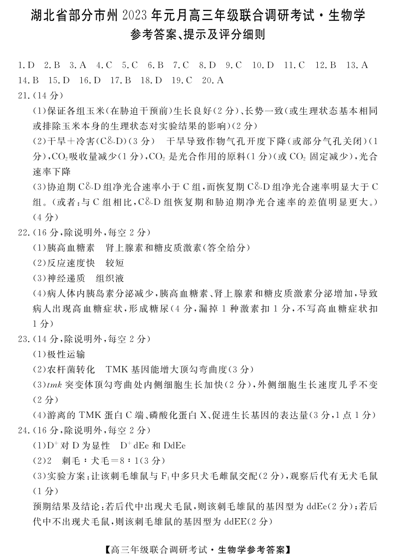 高三生物答案--湖北省部分市州2022-2023学年高三元月联合调研考试