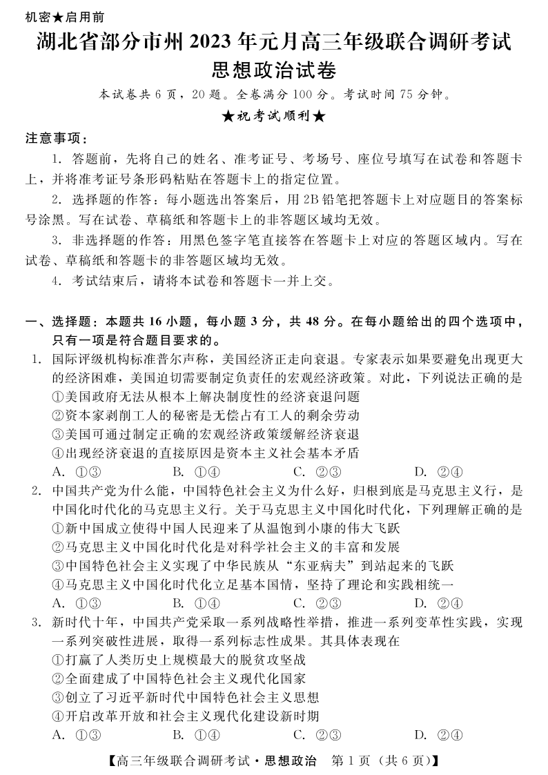 高三政治--湖北省部分市州2022-2023学年高三元月联合调研考试