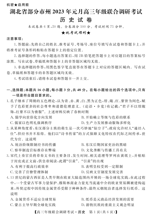 高三历史--湖北省部分市州2022-2023学年高三元月联合调研考试