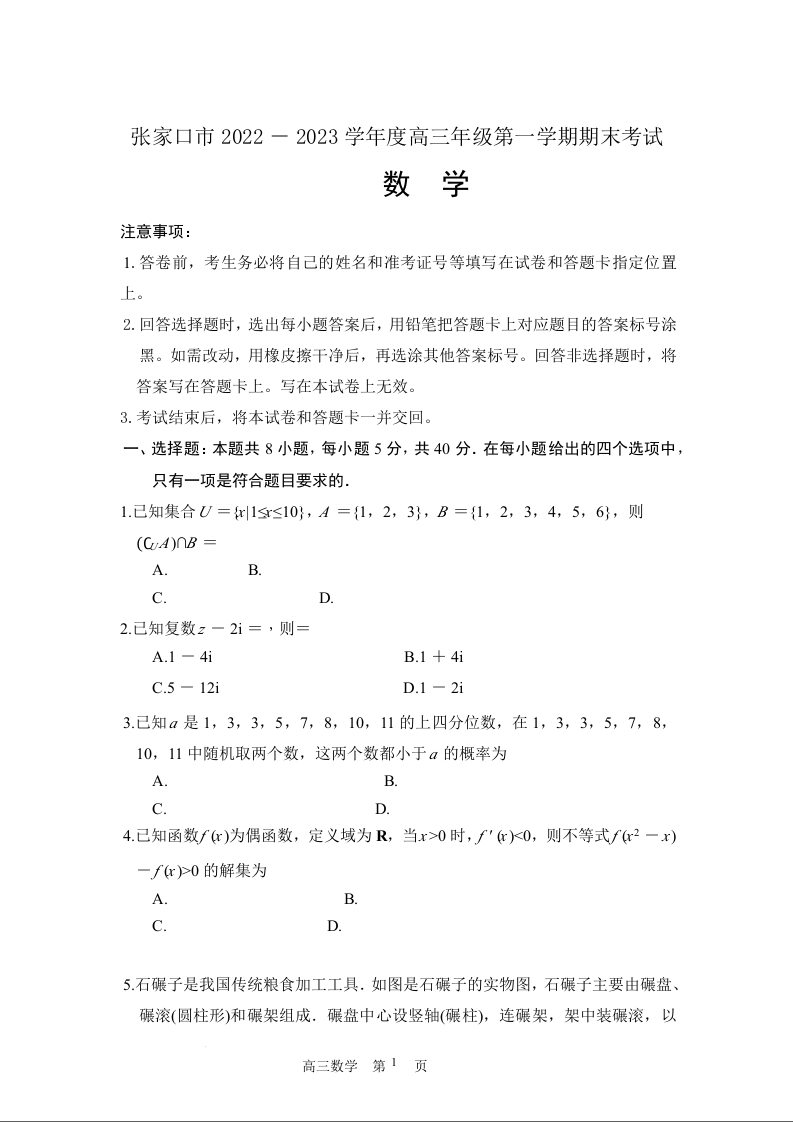 高三数学--河北省张家口市2022-2023学年高三上学期期末考试