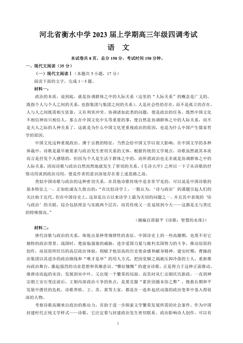 高三语文+答案--河北省衡水中学2022-2023学年高三上学期四调考试