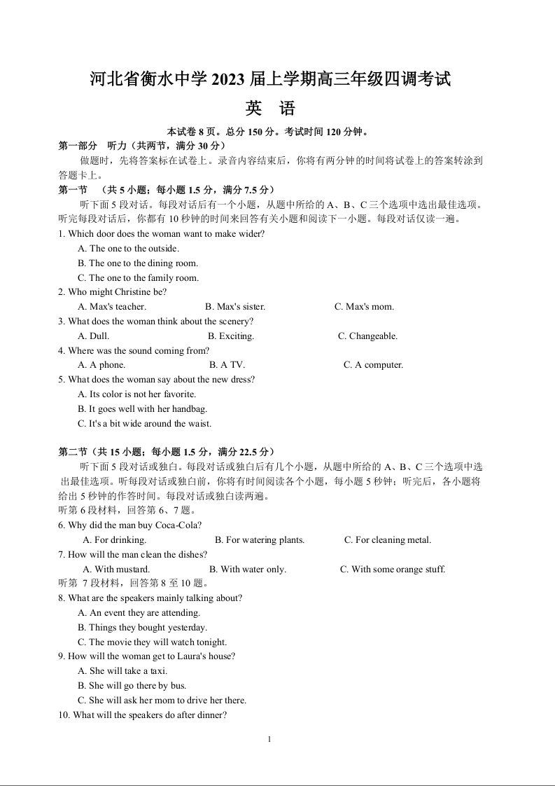 高三英语+答案--河北省衡水中学2022-2023学年高三上学期四调考试