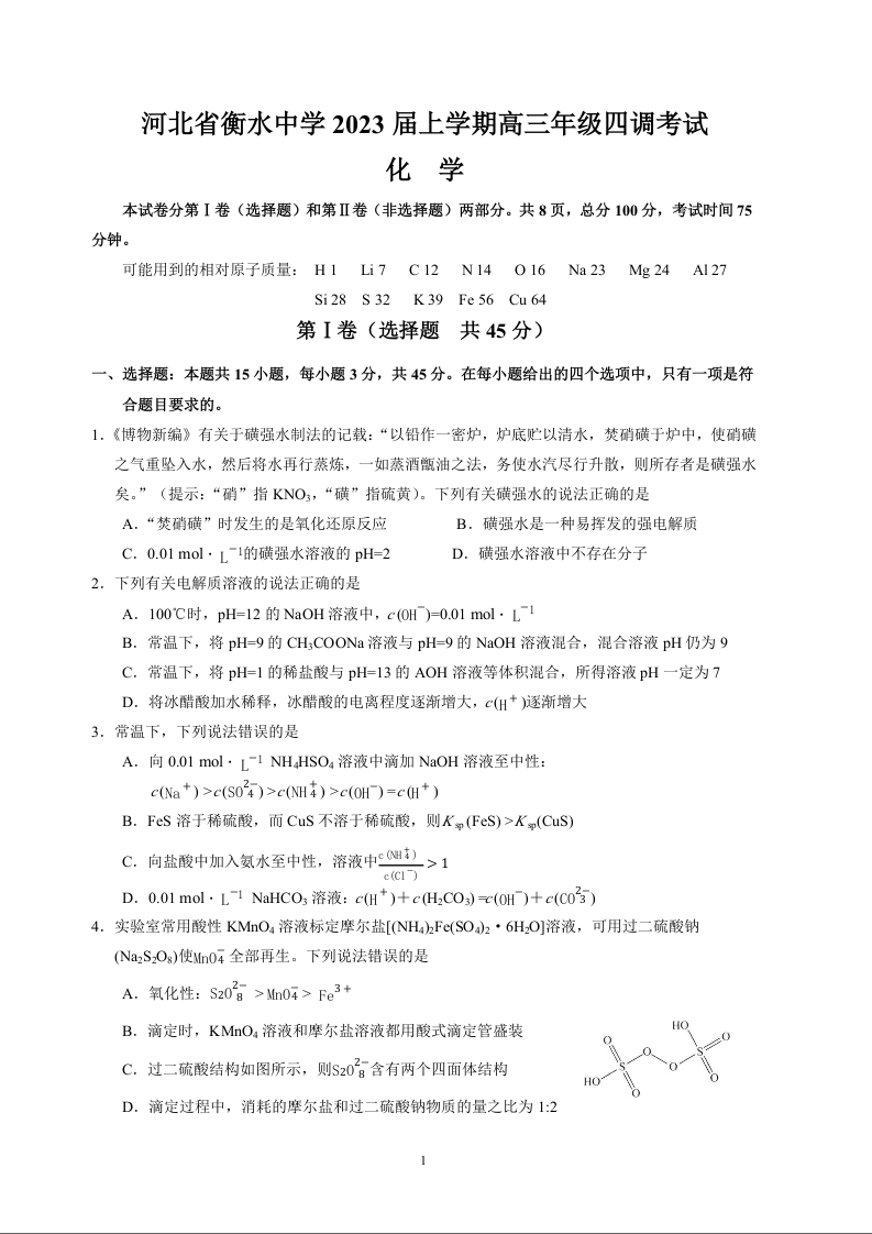 高三化学+答案--河北省衡水中学2022-2023学年高三上学期四调考试