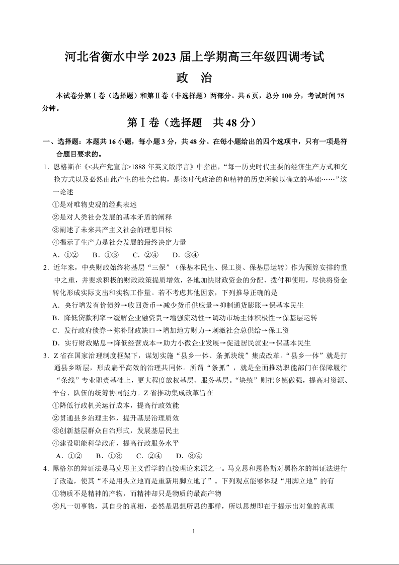 高三政治+答案--河北省衡水中学2022-2023学年高三上学期四调考试