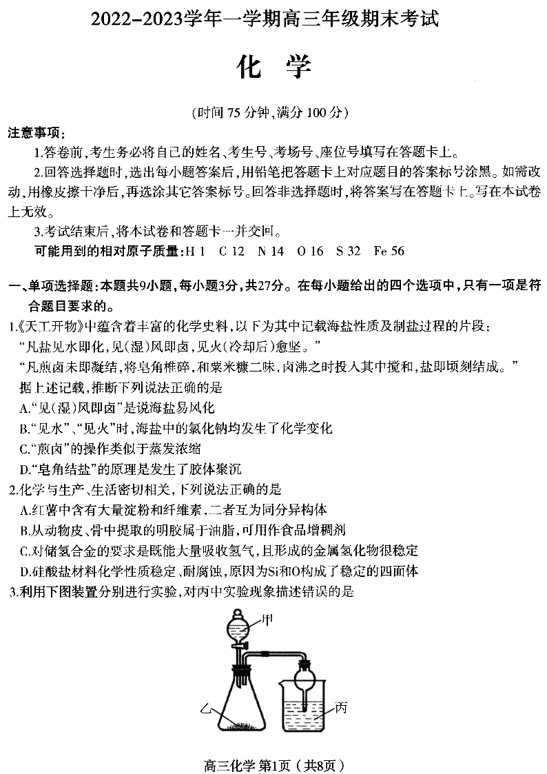 高三化学--河北省石家庄市2022-2023学年高三上学期期末考试试题
