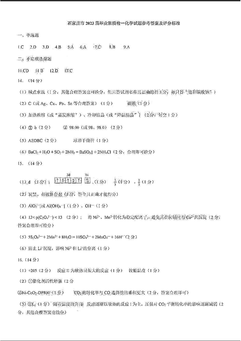 高三化学答案--河北省石家庄市2022-2023学年高三上学期期末考试试题