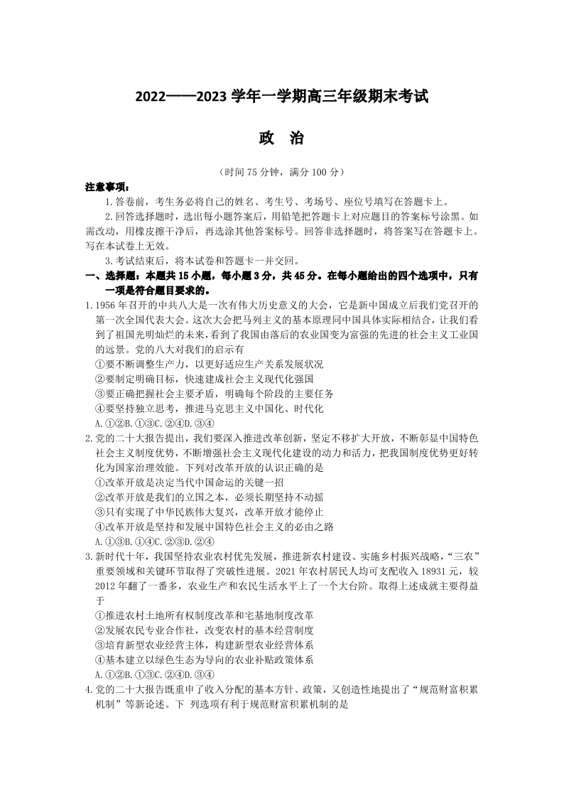 高三政治--河北省石家庄市2022-2023学年高三上学期期末考试试题