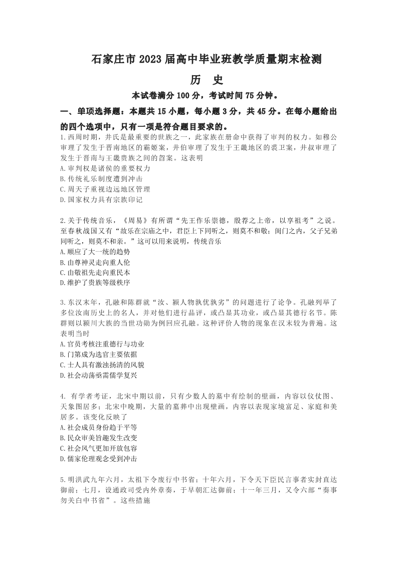高三历史+答案--河北省石家庄市2022-2023学年高三上学期期末考试试题