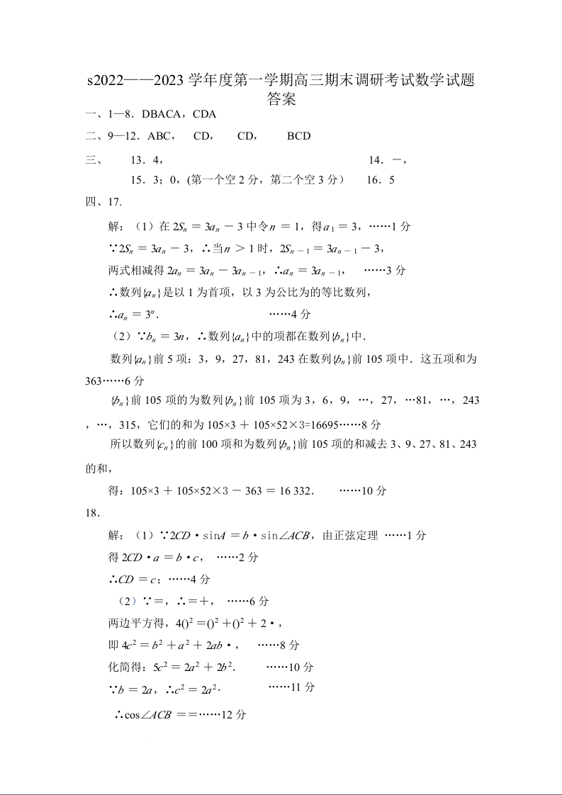 高三数学--河北省保定市2023届高三上学期1月期末调研考试